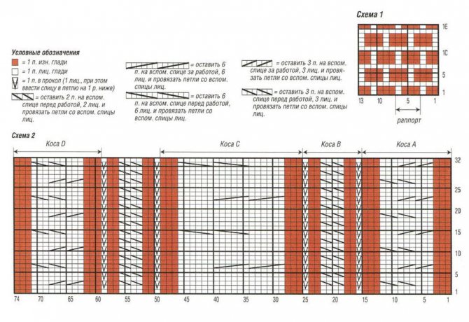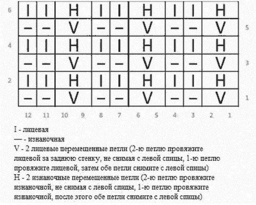 - узоры по схемам А и В: количество петель кратно 12 плюс 2 кром. Выполняем вязку по схемам, на которых показаны только лиц/р. В изн/р петельки провязываем л/п нитью совпадающего цвета, то есть нитью цвета предыдущего ряда. Снятые петельки снова снимаем, как при изн. вязке, пропуская нить перед работой. По ширине ряда повторяем раппорт между кром/п.