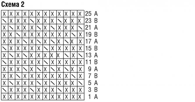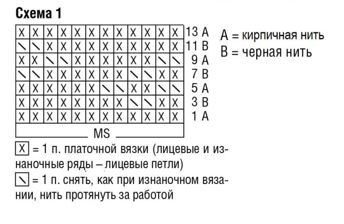 Узор А, выполняемый по схеме 1: провязываем один раз с 1 р. по 14 р. с учётом цвета пряжи.