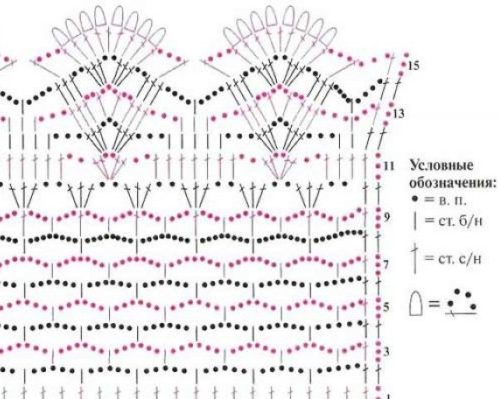 - Расширение изделия получается за счет воздушных петелек в арках верхней французской сетки.