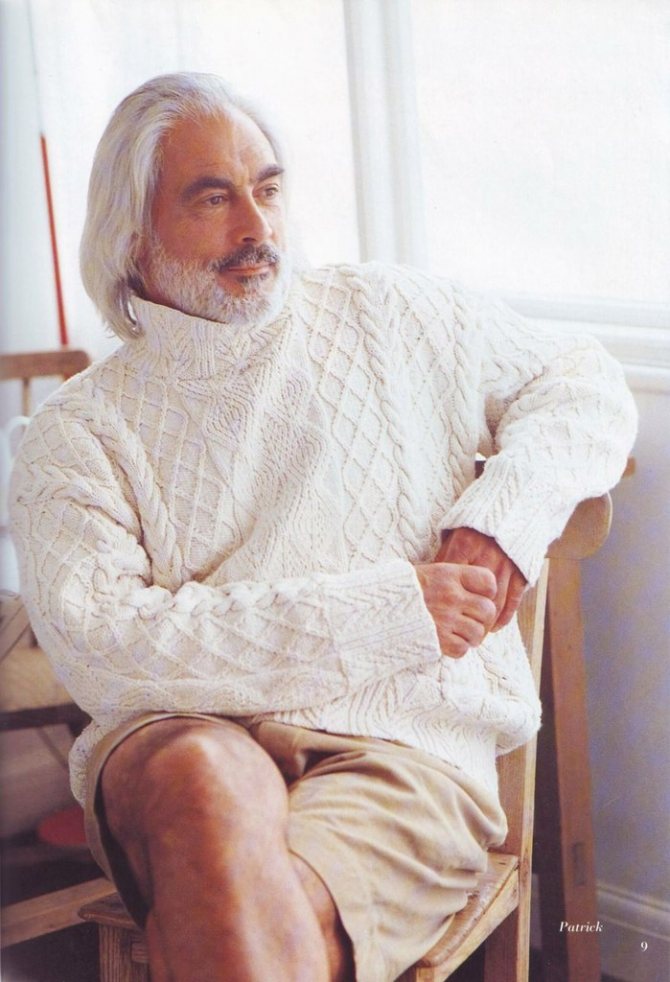 - Пуловер с узором «морские узлы» и косами;