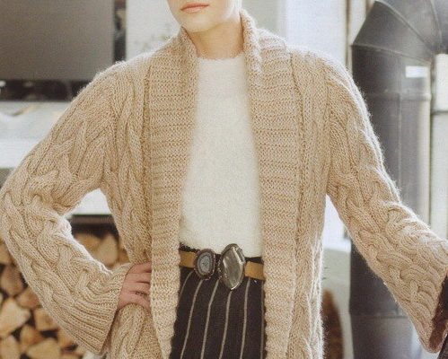 - Пуловер с узором жгутов и шалевым воротником;