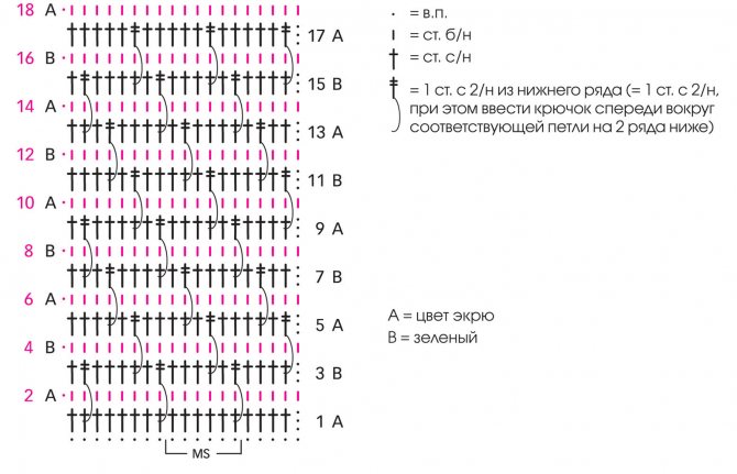 - Основной (число п. кратно 6 + 1): вяжем, придерживаясь предложенной ниже схемы. Начинаем с п. перед раппортом, постоянно повторяем раппорт, заканчиваем п. после раппорта. Выполняем 1-18 рр. х 1, потом постоянно повторяем 7-18 рр, обращая внимание на чередование салатового и молочного цветов нитей.