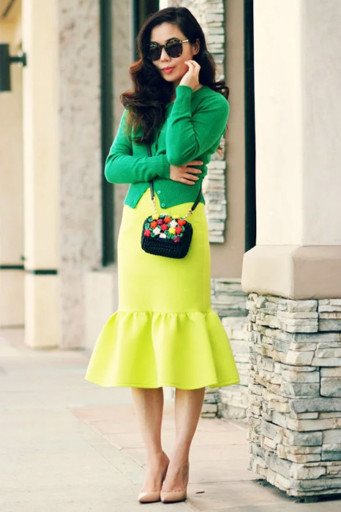 Два ярких оттенка отлично уживаются в одном луке. К юбке можно подобрать свитер насыщенного изумруда и туфли в тон верху.