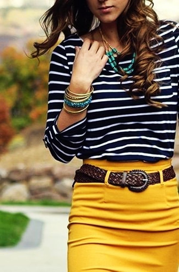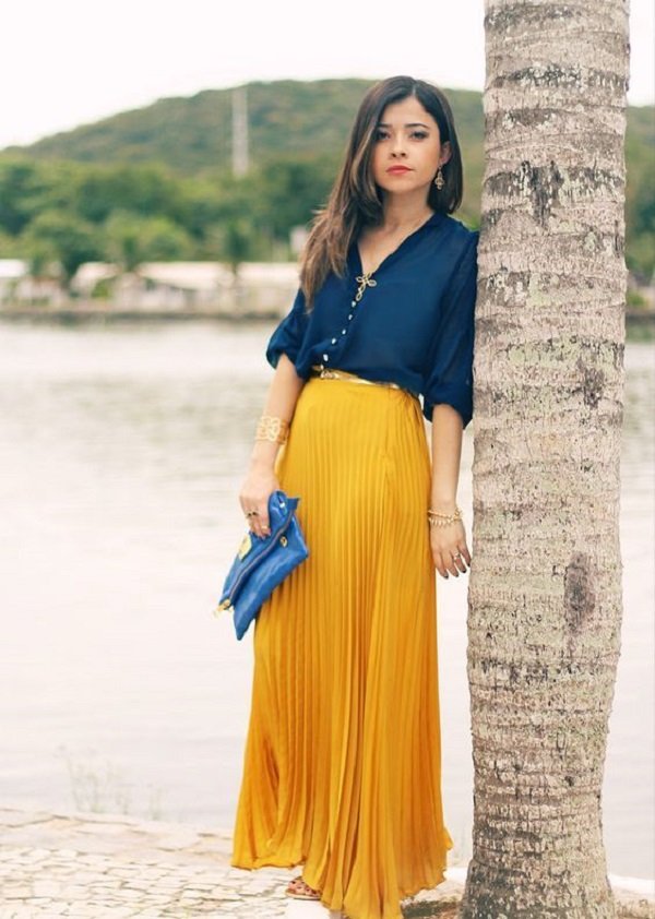 Классическое сочетание, считающееся одним из самых удачных и стильных. Незамысловатый микс, который, тем не менее, позволяет женщине выглядеть великолепно! Желтую юбку носите с синим верхом и дополняйте лук смелыми аксессуарами, например, клатчем с леопардовым принтом.