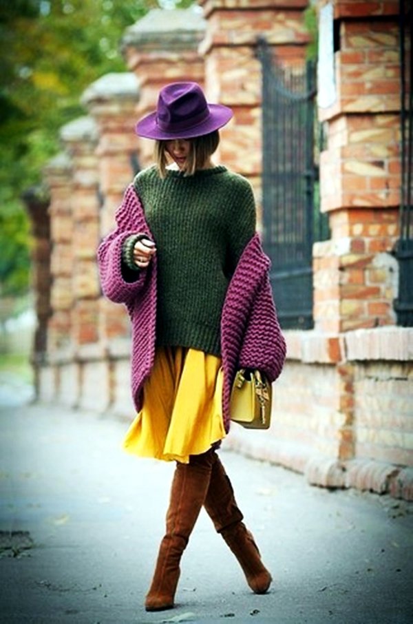 Желтый и коричневый составляют неплохую пару, но составление образа требует безупречного вкуса. Некорректный подбор вещей может сделать лук мрачноватым и неинтересным. Вот неплохое сочетание: желтая юбка, коричневый джемпер, белый шарф с зеленым принтом, рыжие сапоги.