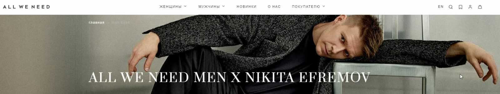 - ALL WE NEED MEN x NIKITA EFREMOV — популярный актер Никита Ефремов стал лицом первой мужской коллекции. На рекламных фотографиях его можно увидеть как в элегантном светлом пальто, так и в небрежно накинутой джинсовой куртке.