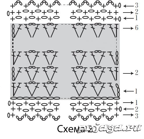Для второй части набираем 58 воздушных петель розовой пряжей и вяжем по схеме 2, где выделено серым фоном. На высоте 4,5 см меняем цвет нити и вяжем ещё 1 см, по схеме 1 с белым фоном. Нижнюю часть выполняем аналогично.