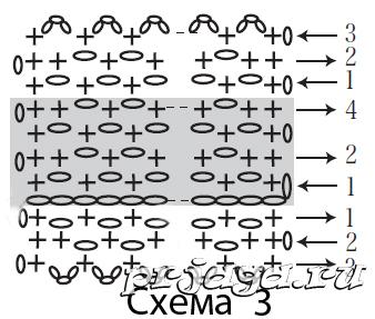 Третья часть. Набираем 25 воздушных петель розовой нитью и вяжем по схеме 3 с серым фоном до высоты 1,5 см. Меняем цвет пряжи на белый и выполняем ещё 1 см по той же схеме, но с белым фоном. Повторяем вязание для нижней части.
