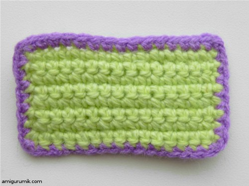 2) Затем обвязываем края пряжей розового цвета. Из каждой петельки вывязываем по одному простому столбику, на углах делаем три. В итоге получается аккуратный ровный прямоугольник. Нить не обрезаем.