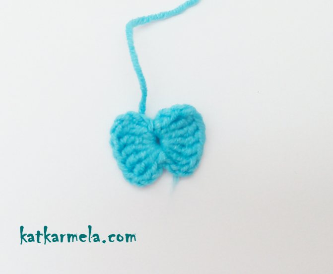 Вторая часть бантика вяжется зеркально, т.е. сразу после сс набираем 3 вп, вяжем 5 с2н, 3 вп и сс в кольцо.