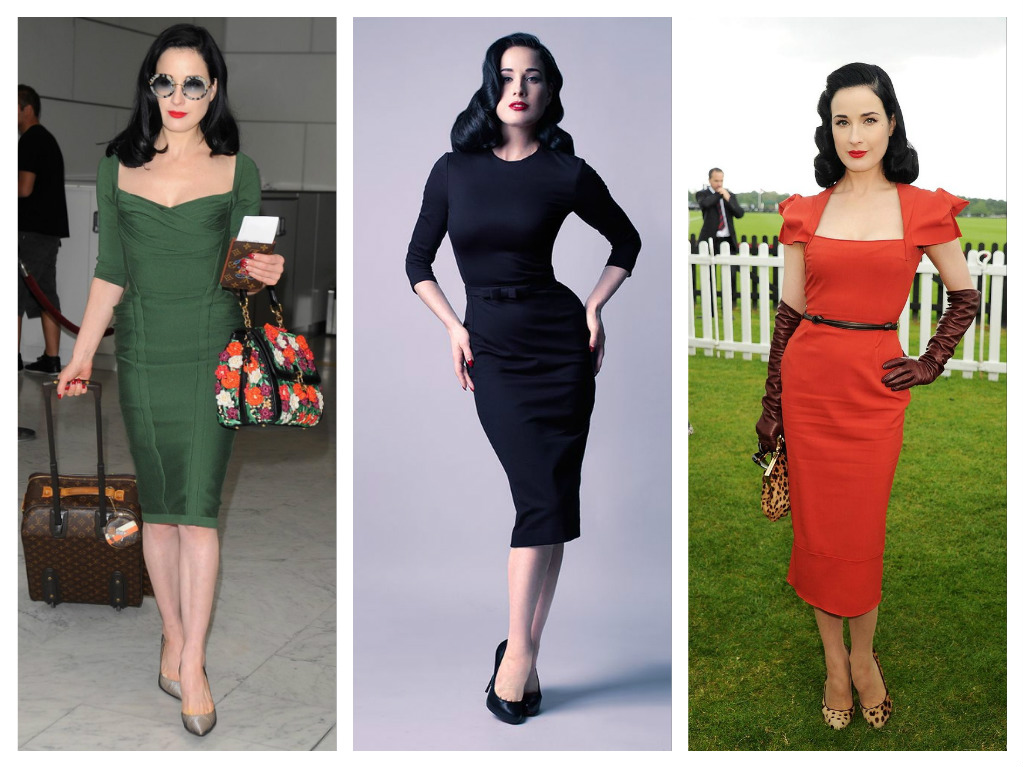 - Платье-футляр. Однотонная модель выгодно подчеркнет соблазнительные изгибы обладательниц фигуры «гитара». Для невысоких девушек рекомендуем платье выше колена. Также стоит иметь классический черный вариант этой модели – маленькое черное платье на все случаи жизни.
