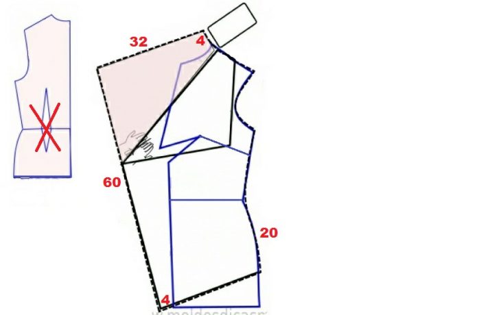 - на полочке закрываю нагрудную вытачку и перевожу её в линию середины полочки, сделав разрез на 24 см. ниже горловины