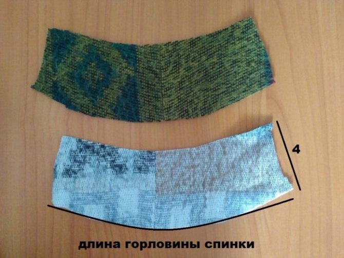 10. Выкраиваю две стойки воротника на спинку. Для этого измеряю длину горловины на спинке. Высота стойки — 4 см.