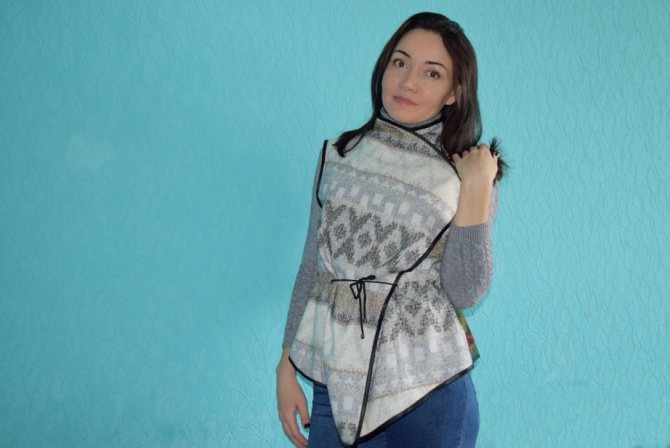 Если вы любите свободу движения, а длинные и широкие рукава мешают, например водить автомобиль, то такой жилет из теплого палантина то что надо! Под низ можно одеть теплую водолазку или свитер.