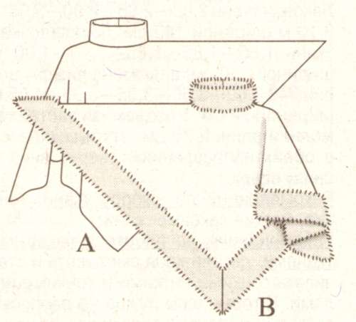 1.Приложите платок на фигуру, поставьте метку для выреза сарафана по груди. Ниже метки платки сострочите (середина переда – шов).