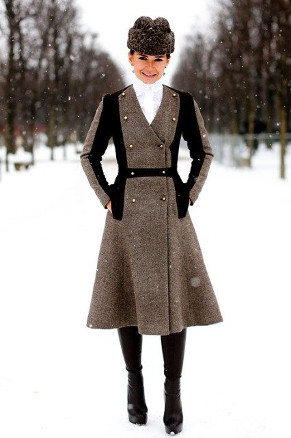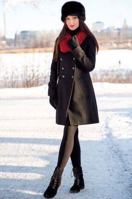 Черная шапка-кубанка гармонирует с двубортным пальто темно-серого оттенка, полуприталенного фасона, длиной выше колен и ботинками черной расцветки на низком ходу и шнуровке.