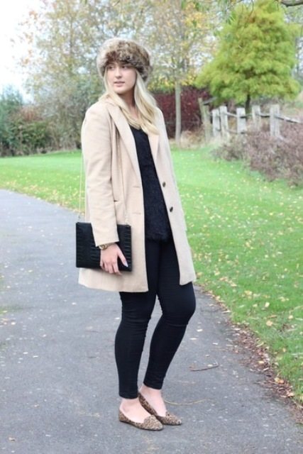 Шапка-кубанка коричневого оттенка сочетается с пальто светло-бежевого цвета, прямого силуэта, длиной выше колен, узкими брюками черного тона, небольшой сумкой и туфлями с анималистическим принтом на плоской подошве.