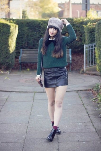 Светло-серая шапка-кубанка будет отлично выглядеть со свитером зеленого цвета, кожаной юбкой облегающего покроя, длиной выше колен и ботинками черной расцветки на низком каблуке.