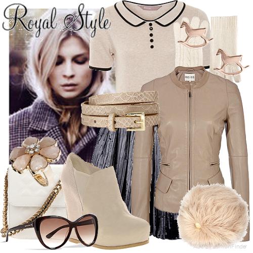 Шапка-кубанка бежевого оттенка хорошо смотрится с короткой кожаной курткой бежевого цвета, юбкой серого тона, расклешенного покроя, длиной выше колен, маленькой белой сумкой и ботильонами бежевой расцветки на танкетке.