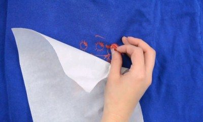 Принт, нанесенный на одежду термическим способом, удаляется так же – с помощью температурного воздействия. Самый простой вариант – разогреть картинку утюгом. Расстелите одежду на ровной поверхности, закройте наклейку с двух сторон (с лица и с изнанки) листами пергаментной бумаги и прогладьте утюгом, нагретым до максимума. Спустя некоторое время, изображение перейдет на пергамент, и вам останется только застирать место, на котором оно находилось, от остатков краски.
