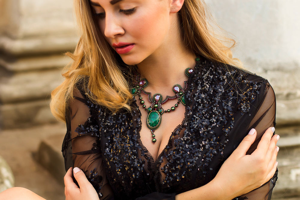 Не забывайте о пропорциях. Если у вас тонкая шея, выбирайте более легкие и изящные модели, а для более полной фигуры подойдут более массивные и крупные колье, которые создадут баланс.