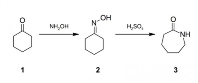 Процесс получения капрона не простой. Вначале путем гидрирования при пониженном давлении и температуре фенол переводят в циклогексанон. Затем, полученное соединение под действием гидроксиламина переходит в циклогексаноноксим (схема 1→2). И уже из него, под действием серной кислоты в ходе протекания бекмановской перегруппировки образуется капролактам(схема 2→3)