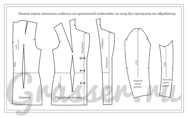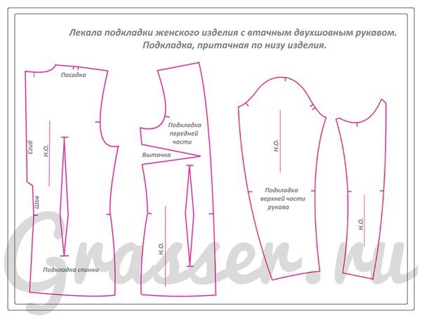 — Детали подкладки это производные лекала, которые строят по основным лекалам из подкладочной ткани. В массовом производстве лекала подкладки конструируются сразу и входят в комплект лекал. В индивидуальном пошиве лекала подкладки не конструируются заранее. Подкладка подкраивается по деталям верха после проведенной примерки и внесенных изменений. Очень часто детали подкладки конструируются по лекалам верха, которые уже имеют припуски, соответственно и лекала подкладки сразу имеют припуски на обработку. Чтобы новички не запутались, данные схемы даны без припусков на обработку швов.