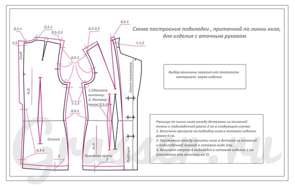 — Важно заранее понять, какой припуск на подгибку низа изделия и низа рукава будут иметь ваши детали верха. Здесь так же не берем в расчет припуск на обработку швов. Считаем только подгибку низа в чистом виде. Для нашей схемы я взяла 4 см по низу изделия и 3 см по низу рукава. От ширины подгибки низа зависит коррекция длины подкладки. Притачная подкладка по низу имеет напуск на свободу. Существует расчет коррекции длины подкладки относительно длины изделия. Из величины припуска на подгибку низа в чистом виде мы вычитаем величину напуска в двойном размере. Оставшаяся величина это и есть величина коррекции длины подкладки. Например: величина подгибки в чистом виде равна 4 см. Напуск равен 1см. Величина коррекции = 4-(1*2)=2см.