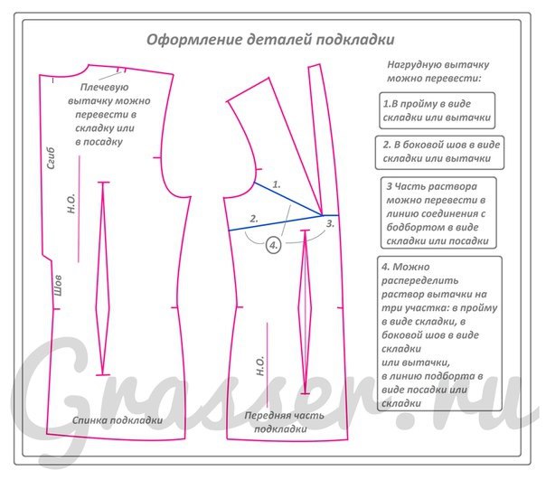 — Раствор нагрудной вытачки в подкладке женских изделий равен ее раствору на детали верха передней части. Но при этом вытачку на подкладке рационально располагать от проймы или от бокового шва. Часть раствора вытачки можно перенести в линию подборта и оформить складкой.