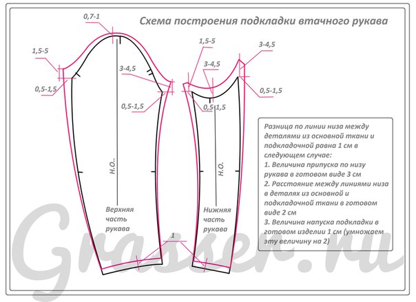 — Подкладка рукава так же имеет дополнительные припуски в области оката. В нижней части оката рукава припуски достаточно большие. Они учитывают огибание припусков проймы основного изделия. А так же учитывается величина скрепления припусков подкладки и припусков основного изделия. Для начала думаю, что информации предостаточно. Главное помнить, что универсальных рецептов не существует! Анализируйте информацию, собственное изделие и применяйте тот вариант конструирования, моделирования или обработки, который будет наиболее удобным именно в конкретном случае!