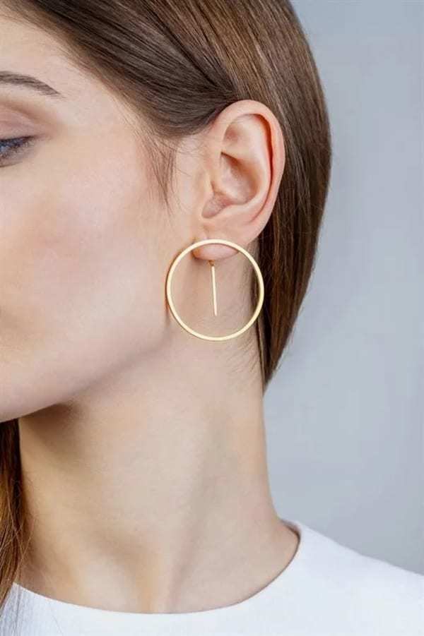 Очень стильно выглядят и сферы, вписанные в кольцо – такая строгая геометрия удачно дополнит современный лаконичный аутфит. Летом носите подобные украшения с платьями-комбинациями на тонких бретелях.