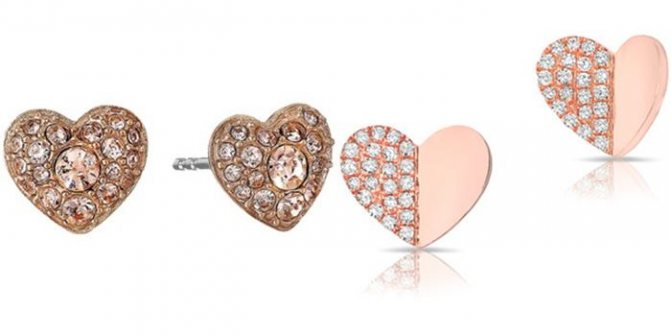 Сердца из металла, из монолитных рубинов, выложенные паве из прозрачных или черных бриллиантов… Есть модели совсем простые, например, гладкие золотые сердечки, а есть интересные фантазийные серьги, которые выглядят не банально, и не сделают их обладательницы таких моделей «ванильную» принцессу.