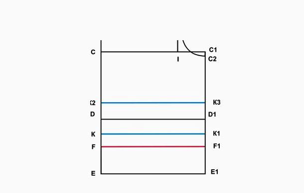 От (∙) К1 в левую сторону откладываем 10…12 см, отмечаем (∙) Е1. От (∙) К3 влево отмеряем 15…18 см, отмечаем (∙) Е. Строим отрезок ТТ1, обозначающий линию входа в карман.