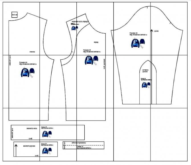 Для раскроя толстовки нам потребуется выкройка. Как построить выкройку свитшота с втачным рукавом – см. выше. Можно использовать готовые лекала.