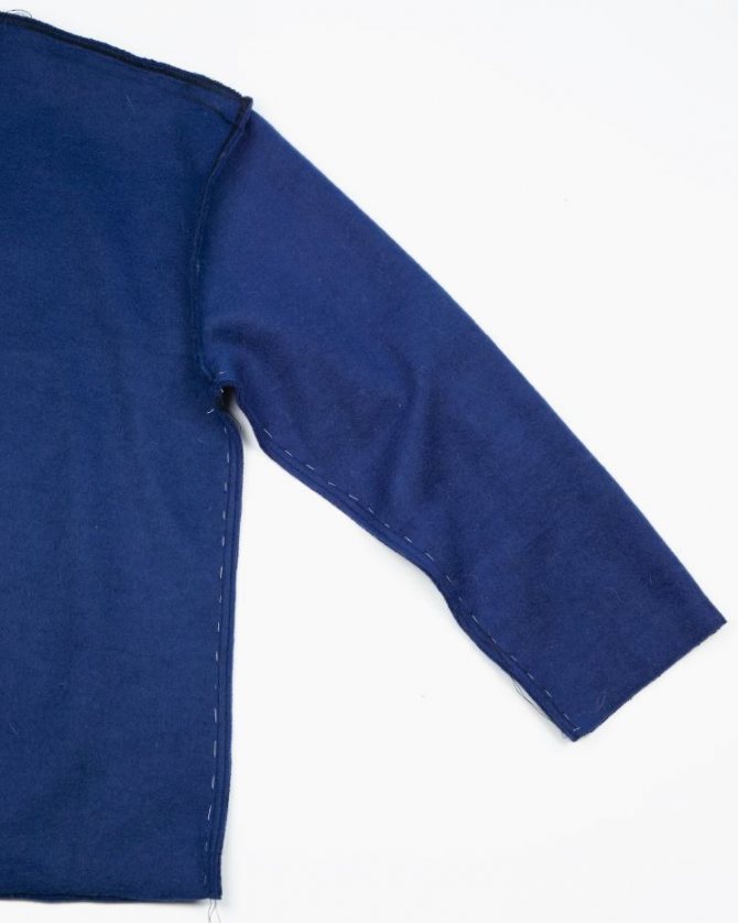 Сложив изделие пополам изнаночной стороной наружу, стачиваем швы на рукавах и боках.