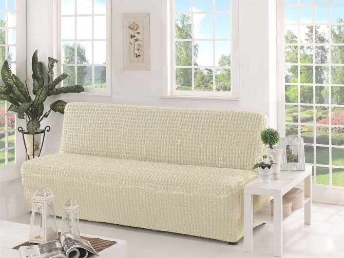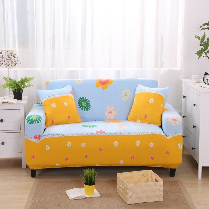 Если предмет мебели стоит по центру комнаты, то нужно рассматривать модели, которые смогут закрыть и спинку. Очень удобно наличие резинок, предотвращающих сползание покрывала.