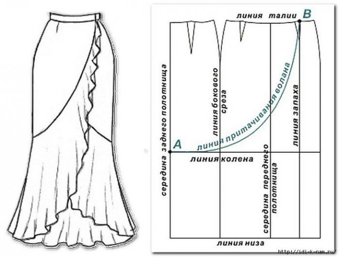 Чтобы пошить легкую и практичную юбку с запахом на резинке, стоит использовать следующую выкройку:
