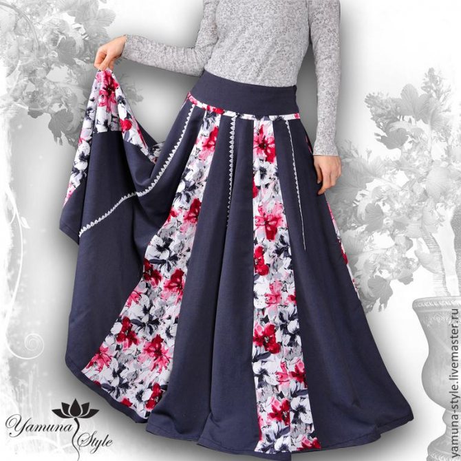 В этом уроке подробно показано, как раскроить и сшить юбку любой ширины — это зависит от прибавки к объему талии и бедер. Чтобы юбка получилась более широкой к низу, то лучше сделать больше клиньев, которые будут расширены к низу. Такая юбка представлена на первом фото: по талии нет прибавки, но к низу клинья сильно расширены. На втором фото клинья расширены равномерной прибавкой по всей длине клина и собраны по талии на сборку. Также для юбки в пол можно оформить низ оборкой, как бы добавить и длины, и ширины. Кстати, если у вас не хватает ткани или нужно обновить надоевшую юбку, то этот элемент можно использовать из отделочной ткани, широкого кружева или вышитого полотна.