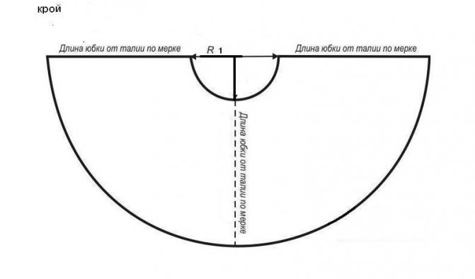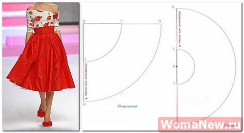 - Солнце. Просторный вариант изделия, который точно состоит из 1-й детали. Обычно это круг из ткани, в центре которого вырезается меньший круг по объему талии.