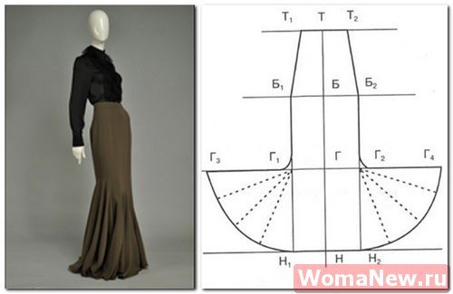 Вот еще один вариант выкройки юбки в пол — на основе юбки годе.