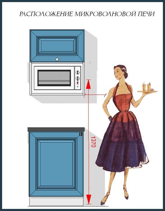 Например, считается, что микроволновая печь должна располагаться на высоте от 90 до 150 сантиметров от пола.