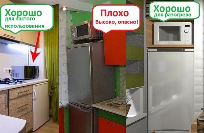 Оптимальная высота — если СВЧ находится чуть ниже плеча хозяйки. Очевидно, что современные холодильники высотой от 170 сантиметров — не лучший выбор для расположения СВЧ.