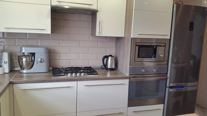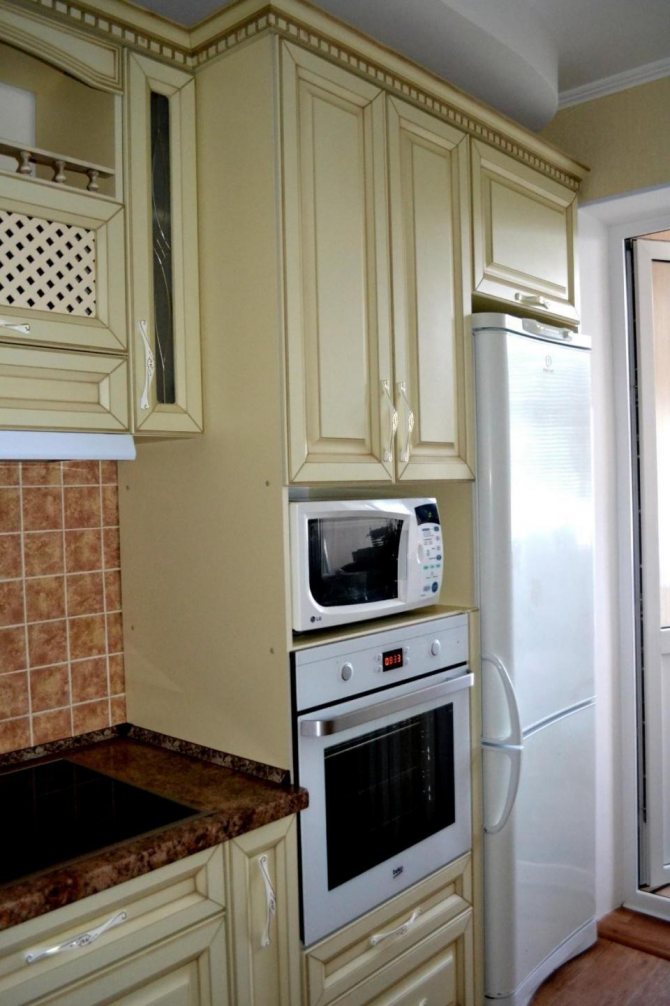 На фото можно увидеть не очень удачный пример размещения холодильника рядом с микроволновкой и духовым шкафом. Духовка — техника сильно нагревающаяся, поэтому она должна стоять отдельно от остальной.