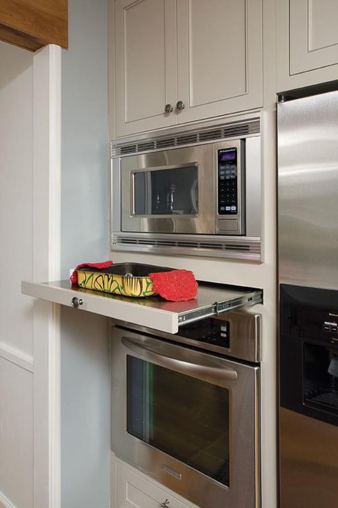 - микроволновка на столешнице — хороший вариант, но придется искать место для посуды и вещей, которые сейчас там располагаются. И часто придется наводить порядок и «искать» печь перед тем, как разогреть еду, потому что доступ к СВЧ может быть перекрыт посудой.