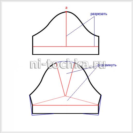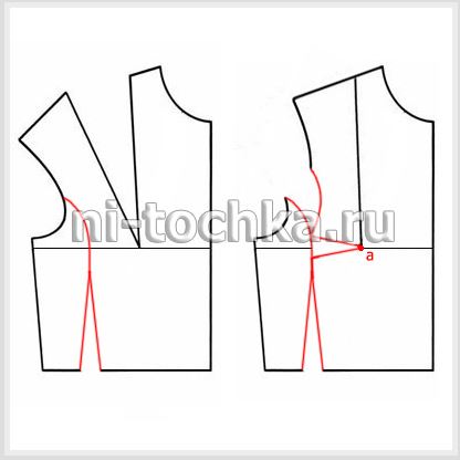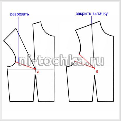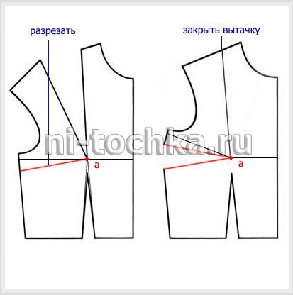 Переснимаем базовое лекало. Из точки «а» проводим прямую (выделена красным на чертеже ниже). Разрезаем по ней лекало, закрываем нагрудную вытачку.