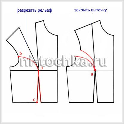 Убираем старую тальевую вытачку. Полностью вырезаем раствор новой вытачки по линии рельефа. От точки «а» проводим на линию рельефа линию немного ниже линии груди.