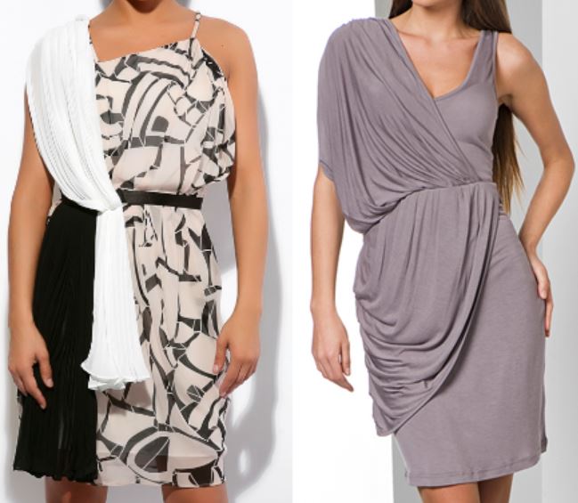 - через плечо: нашиваются на нижнее платье. Подготовленный отрез ткани перебрасываем через одно плечо. Закрепляется такая драпировка в двух местах — на плечевом шве и на талии (или бёдрах) потайным швом или специальной деталью кроя;