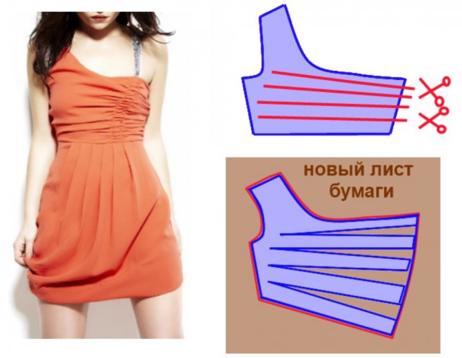 По этой разметке делаем разрез, закрываем плечевую вытачку, фиксируем скотчем. В результате получаем новый вариант лифа.