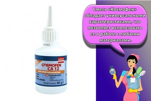 Смесь «Космофен» обладает универсальными характеристиками, что позволяет использовать ее в работе с любыми материалами. Цианакрилатный клей быстрого схватывания удобен в нанесении и для прочного соединения требует плотного сжатия прессом обрабатываемого участка. Раствор претерпевает окружающую температуру до +80 градусов, поэтому нельзя подвергать шов большему нагреву, чтобы клей не расплавился. Из-за выделения токсических компонентов при использовании «Космофена» нужно проводить ремонт автомобильного тента в постоянно проветриваемом помещении.