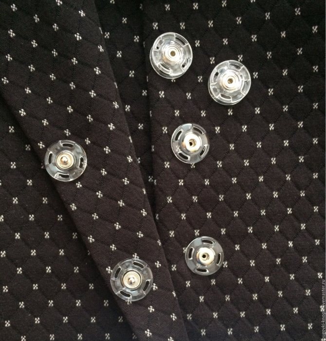 Подходит для установки застежки, состоящей из двух деталей. Их пришивают вручную таким образом, чтобы с лицевой стороны вещей швы были незаметны. Причем сначала устанавливают верхний элемент кнопки, а потом нижний. Для оформления одежды используются как металлические, так и пластиковые изделия: